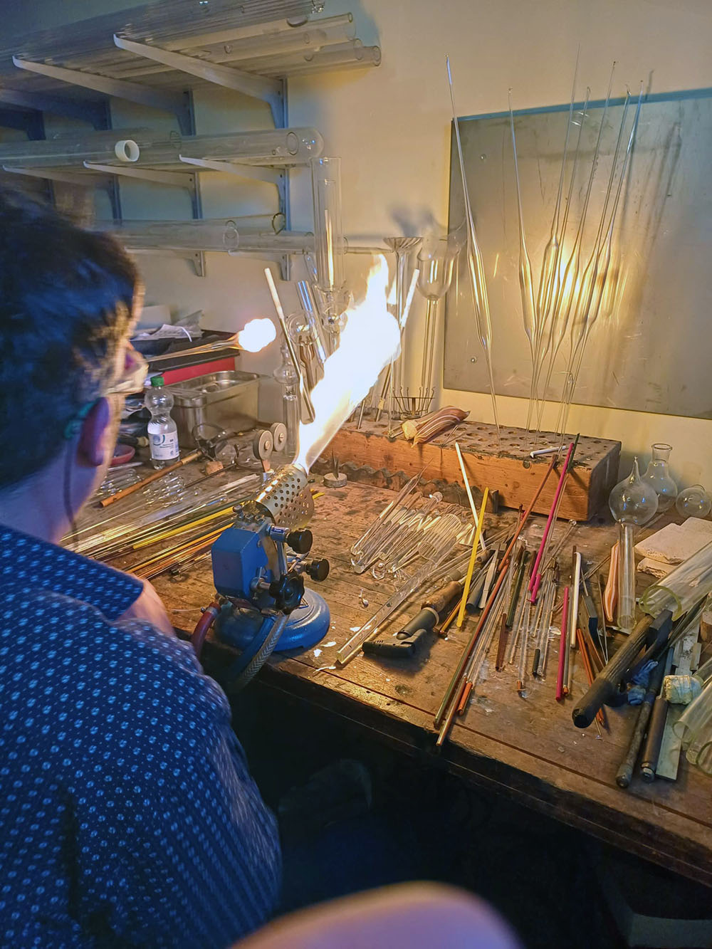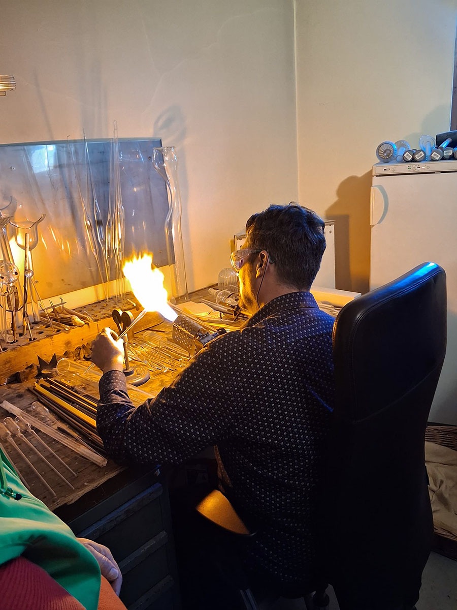 Dort konnte das Glas blasen unter fachlicher Anleitung ausprobiert werden.